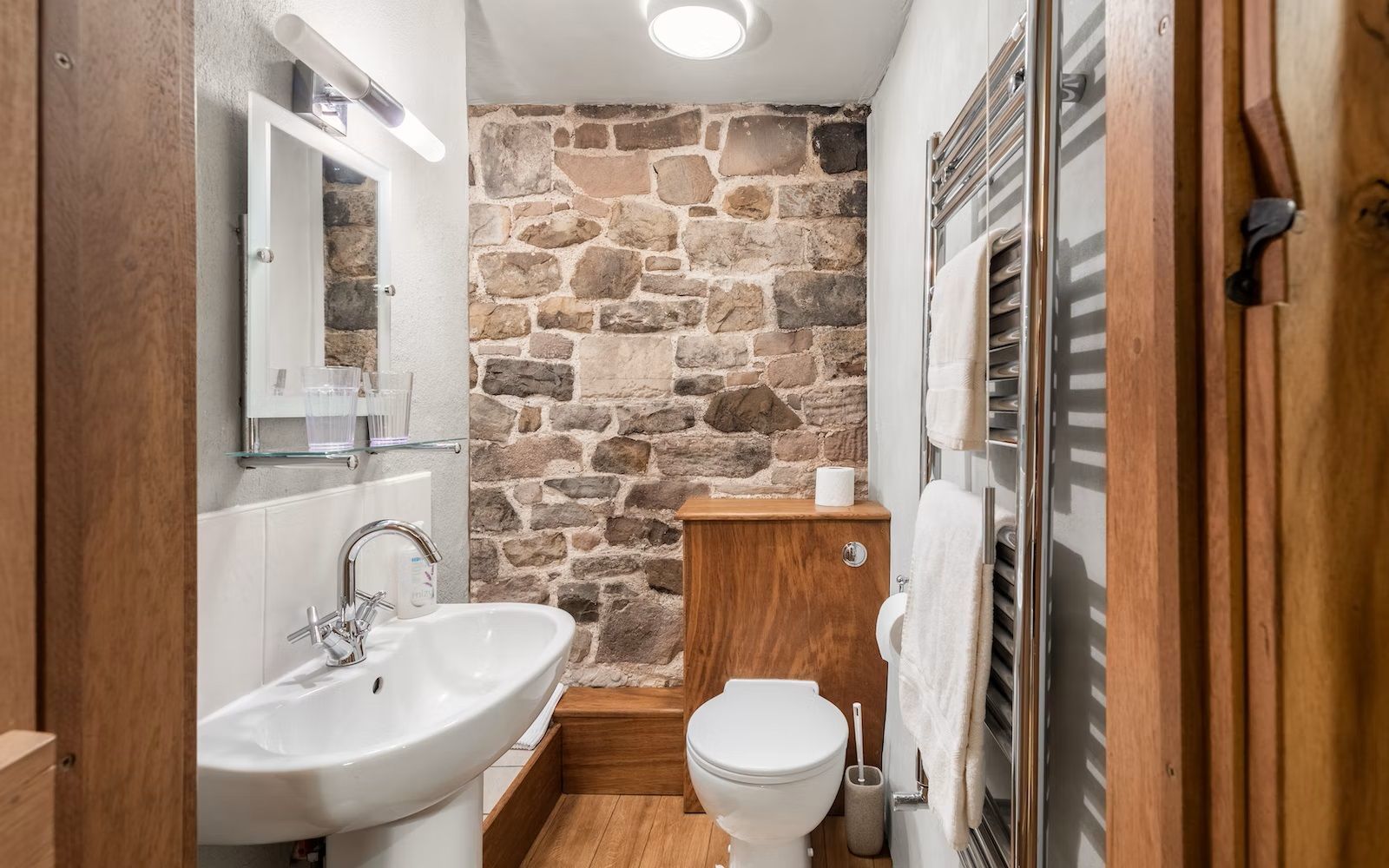 As you climb the unique stone stairs to the first floor large landing area you are wowed by the apex and roof space of the the original barn, it was important that we kept this 'barn feeling'. Just off this landing area is a family bathroom with a bath and shower over and a basin and WC, and then a wonderful wooden oak staircase created to take you up to the bedroom on the second floor by Haddon Estate especially for us from a single tree off their Estate (so using local wood and heritage skills again)