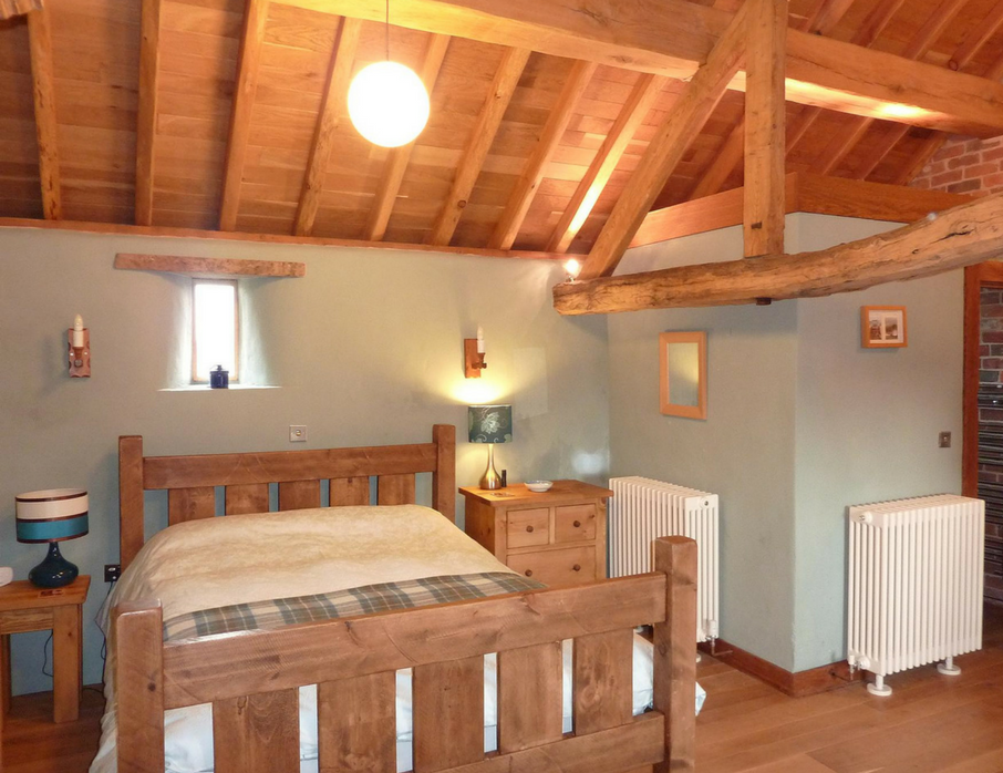 There are four super comfortable bedrooms at The Old Cartshed. The large family bedroom is full of character with original wooden A-Frames and beams, exposed brick and stone work, oak vaulted tall ceilings and solid oak flooring. Ideal for a couple with the comfy Kingsize bed but also in this room is an adult size strong bunk beds for adults or children, as well as a wooden cot. This room also has it's own ensuite shower room.